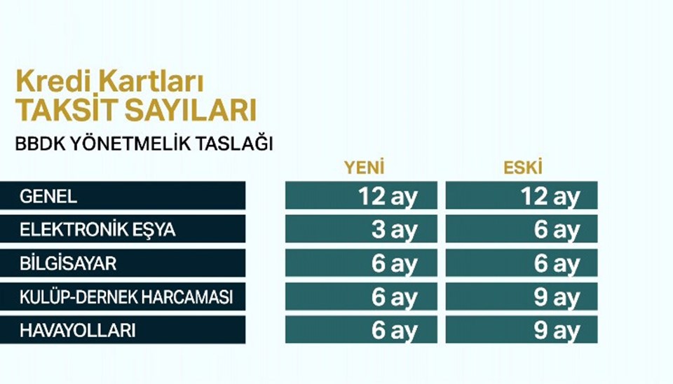 “Mal veya hizmet alımı sonrası belli bir ücret karşılığı borcun taksitlendirilmesi veya ödemenin ertelendiği dönemler de dahil olmak üzere, kredi kartları ile gerçekleştirilecek mal ve hizmet alımları ile nakit çekimlerinde taksitlendirme süresi 12 ayı geçemez. Bu süre elektronik eşya alımlarında 3 ay, bilgisayar alımlarında, kulüp ve derneklere yapılan ödemelerde, havayolları, seyahat acenteleri, taşımacılık ve konaklama ile ilgili harcamalarda 6 ay, sağlık ve sosyal hizmetler ile ilgili harcamalarda ve sağlık ürünü alımlarında, vergi ödemelerinde 9 ay olarak uygulanır. Kredi kartlarıyla gerçekleştirilecek kuyum, telekomünikasyon, doğrudan pazarlama ile ilgili harcamalar, yurt dışında yapılan harcamalar ve, yemek, gıda, alkollü içecek, akaryakıt, kozmetik, ofis malzemesi ile hediye kart, hediye çeki ve benzeri şekillerde herhangi somut bir mal veya hizmeti içermeyen ürünlerin alımlarında taksit uygulanamaz.”