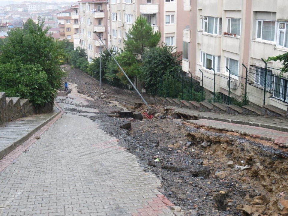 İstanbul’da etkili olan sağanak yağış nedeniyle Üsküdar Bosna Bulvarı, Göktürk sokaktaki yol çöktü. Sokak araç ve yaya trafiğine kapatıldı. Sel suları nedeniyle kaldırım da aşınırken, yol kenarındaki elektrik direkleri yan yattı. -
